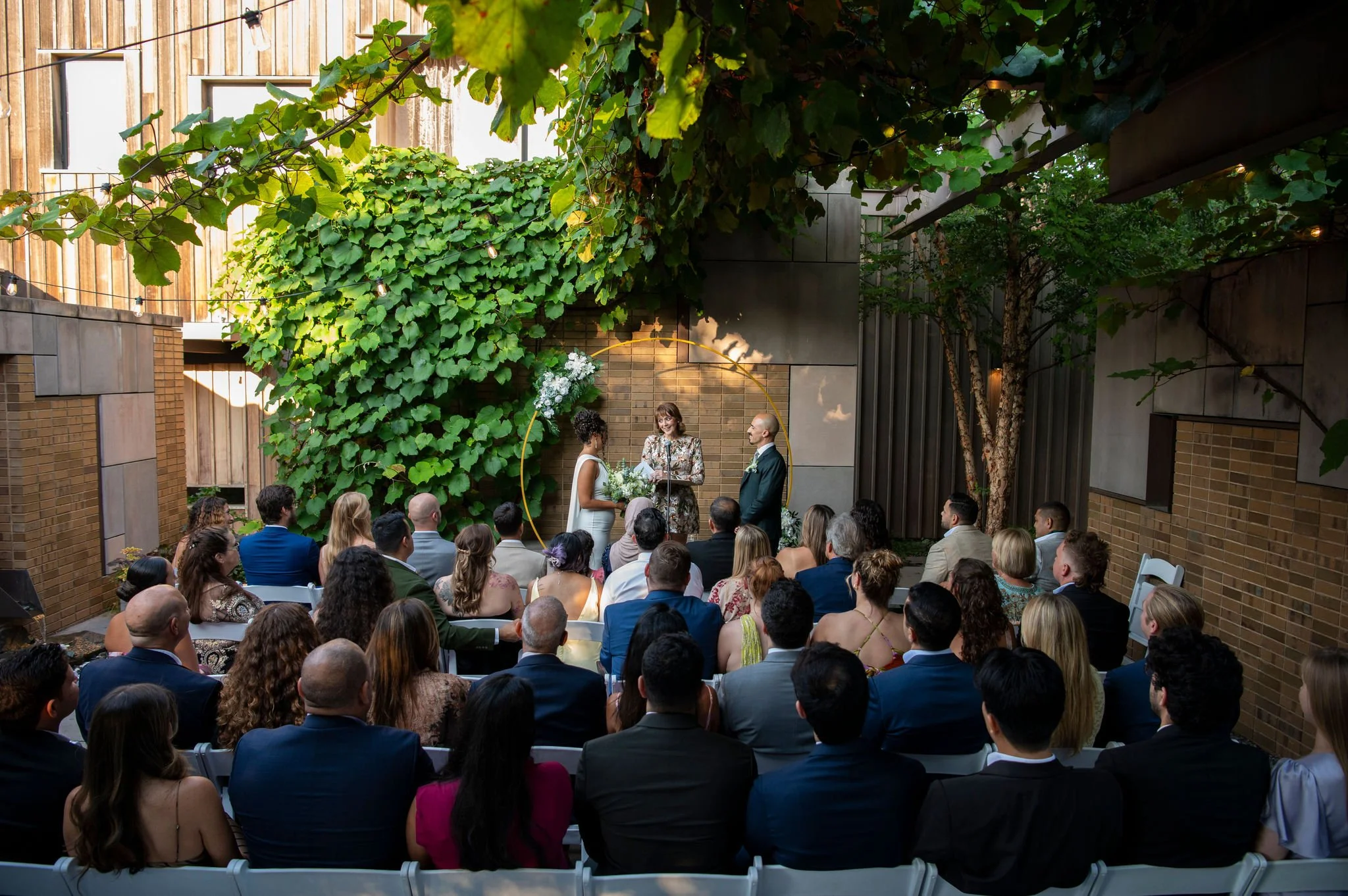 Our lush botanical garden creates a built-in backdrop for your ceremony, eliminating the need for excessive décor. Surrounded by ferns, grasses, and seasonal blooms, couples exchange vows in an atmosphere that feels both private and effortlessly elegant. Guests gather just steps away, immersed in nature while still in the heart of Brooklyn.